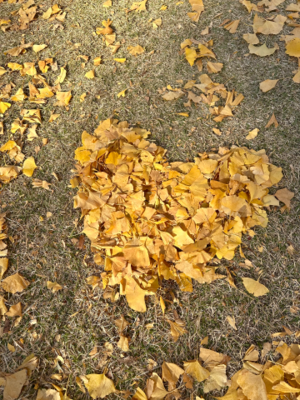 イチョウの落ち葉でハートを作って