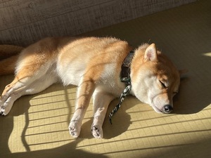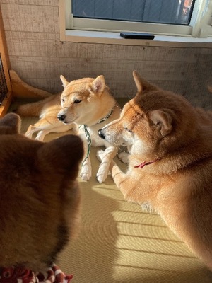 芝犬にもヒエラルキーがあるらしく、ボス犬は陽が1番あたる場所に両脚伸ばして寝そべって、下っぱの子犬は下敷きになっていました。