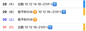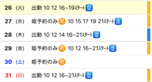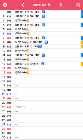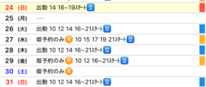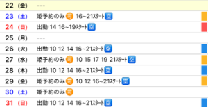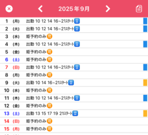 9月前半の出勤予定です。