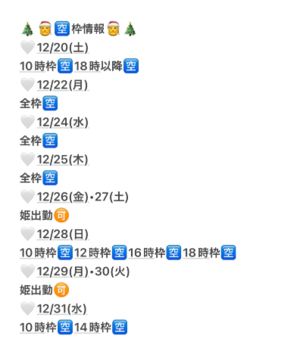 出勤日:?10時/12時/14時/16(17)時/19(18)時/21(20)時枠受付?