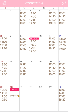 12:00〜.14:30〜.17:00〜.19:30〜