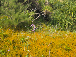 奄美大島の浜に咲く紫色の花:ハマダイコン(浜大根)と黄色い植物:スナヅル