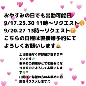 おやすみの日でも姫予約でしたら、出勤可能ですのでリクエスト🉑です🎵