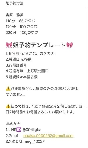 姫予約ですと先の予定まで約束可能ですのでご連絡お待ちしてます〜🎀!!
