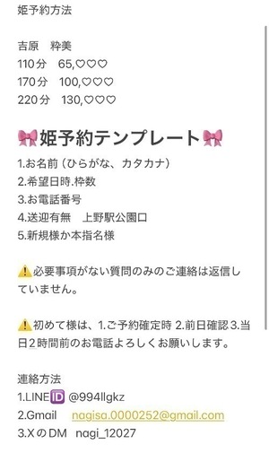 LINE、Gmail、XのDMからお約束可能🉑