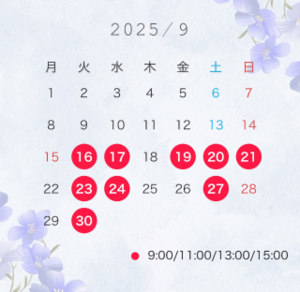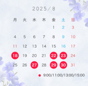 今月は残り3日間となりました明日、29,30日です9月前半はお休みをいただきますので、ここを逃すと次会えるのは半月後