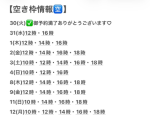 この3日間で10人以上をお断りしました。(ほとんどが先約ありの本日12時枠?)断るのもメンタルに来るので空き枠を確認してから連絡くださいませ。