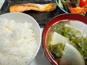 さて今日の夜ご飯は鮭とお味噌汁と