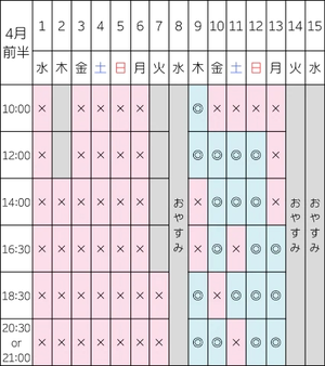 土日祝は特に早い時間帯(10:00/12:00/14:00)が