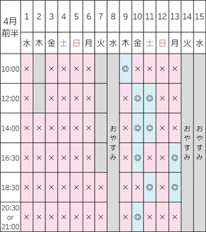 【4/10 12:00/14:00/16:30/20:30】
