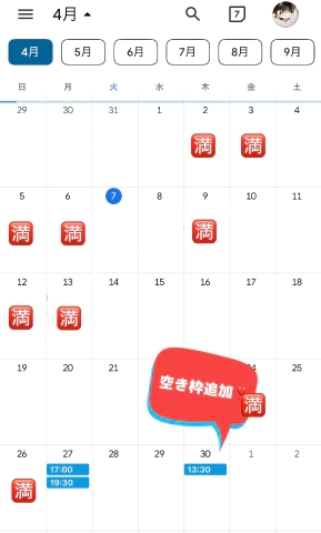 ⬇️直近の空き枠⬇️4月残り空き枠27日(月)14:30〜/17:00〜/30日(木) 13:30〜/5月の予定