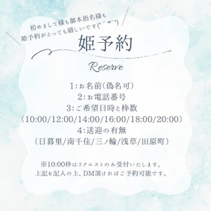୨୧┈┈┈┈┈┈┈┈┈┈┈┈୨୧姫予約ご希望の方は必要項目を記入の上ご連絡を頂ければと思います。(項目記入ない方へ返信はいたしません)